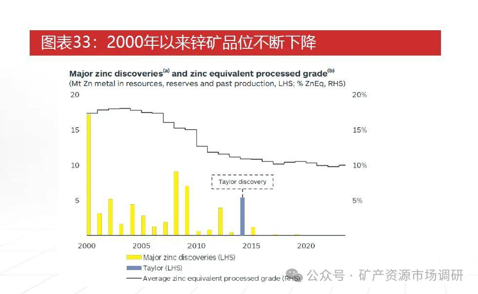 ◼ 2000年以来锌精矿的品位一直不断下降,同时近几年来也没有新开发的矿山。目前国内可预见的主要增量来自于新疆的火烧云项目。