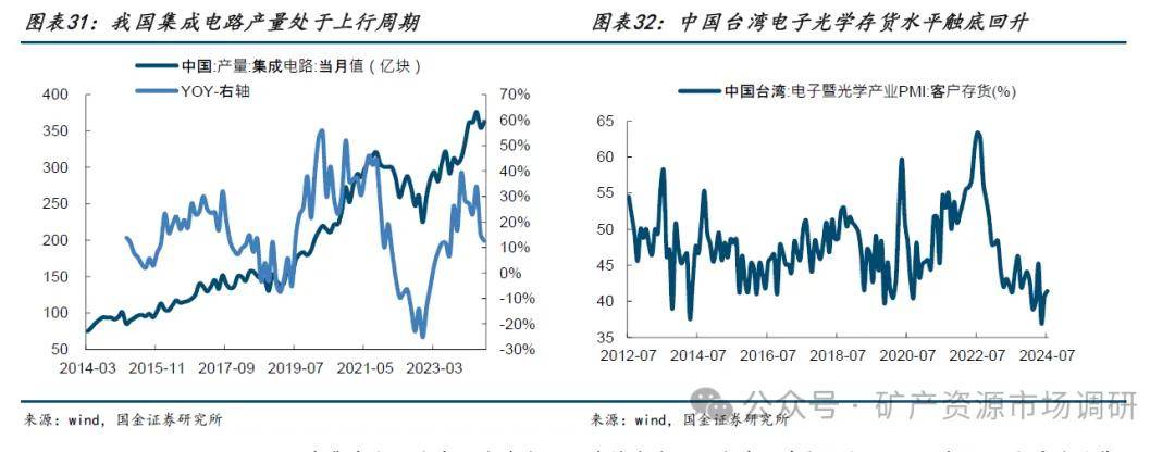 日本集成电路产成品库存亦历经连续去库后,亦步入底部区间;2024 年5 月半导体销售额为36.9 亿美元,环比+1.4%。韩国半导体库存仍处加速去库阶段,生产情况较为旺盛。