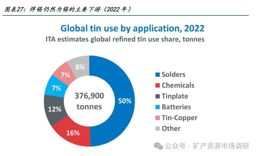 因为锡具有低熔点、良好的流动性、与多重金属的良好亲和力以及较好的导电性,因而广泛应用于电路板焊接。根据 ITA ,锡主要用量在于焊锡 2022 年全球需求占比为 50%50%,其次为锡化工( 16%16%)、镀锡板 12%12%)和铅酸电池 12%12%)。