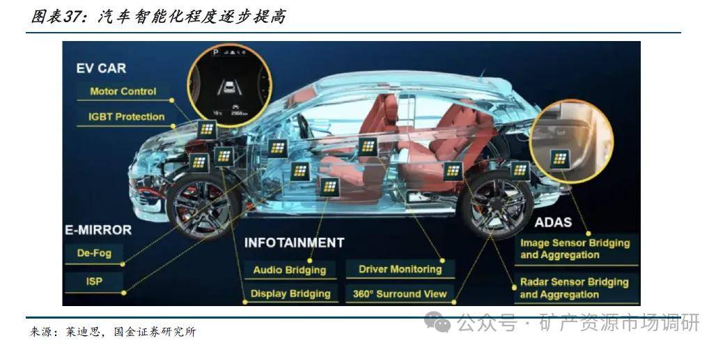 中国汽车工业协会数据显示,传统燃油车所需芯片数量为600 700 颗,电动汽车所需的芯片数量将提升至 1600 颗,而更高级的智能汽车对芯片的需求量将有望提升至 3000 颗。