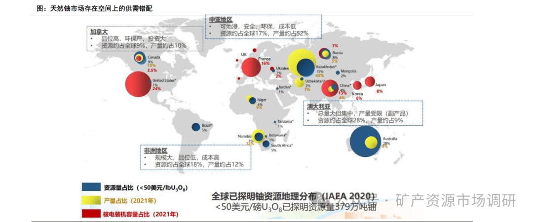 u 天然铀资源量、产量和核电装机容量存在明显的空间错配,供应支出不足且存在不稳定性;叠加铀一次供应增量有限,二次供应部分变二次需求,铀供需格局矛盾突出。