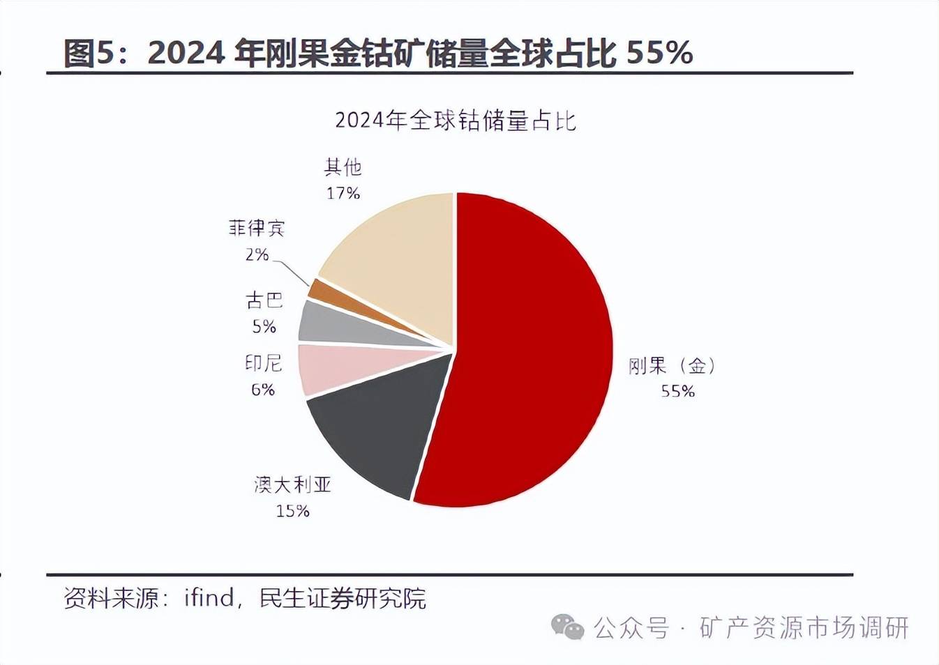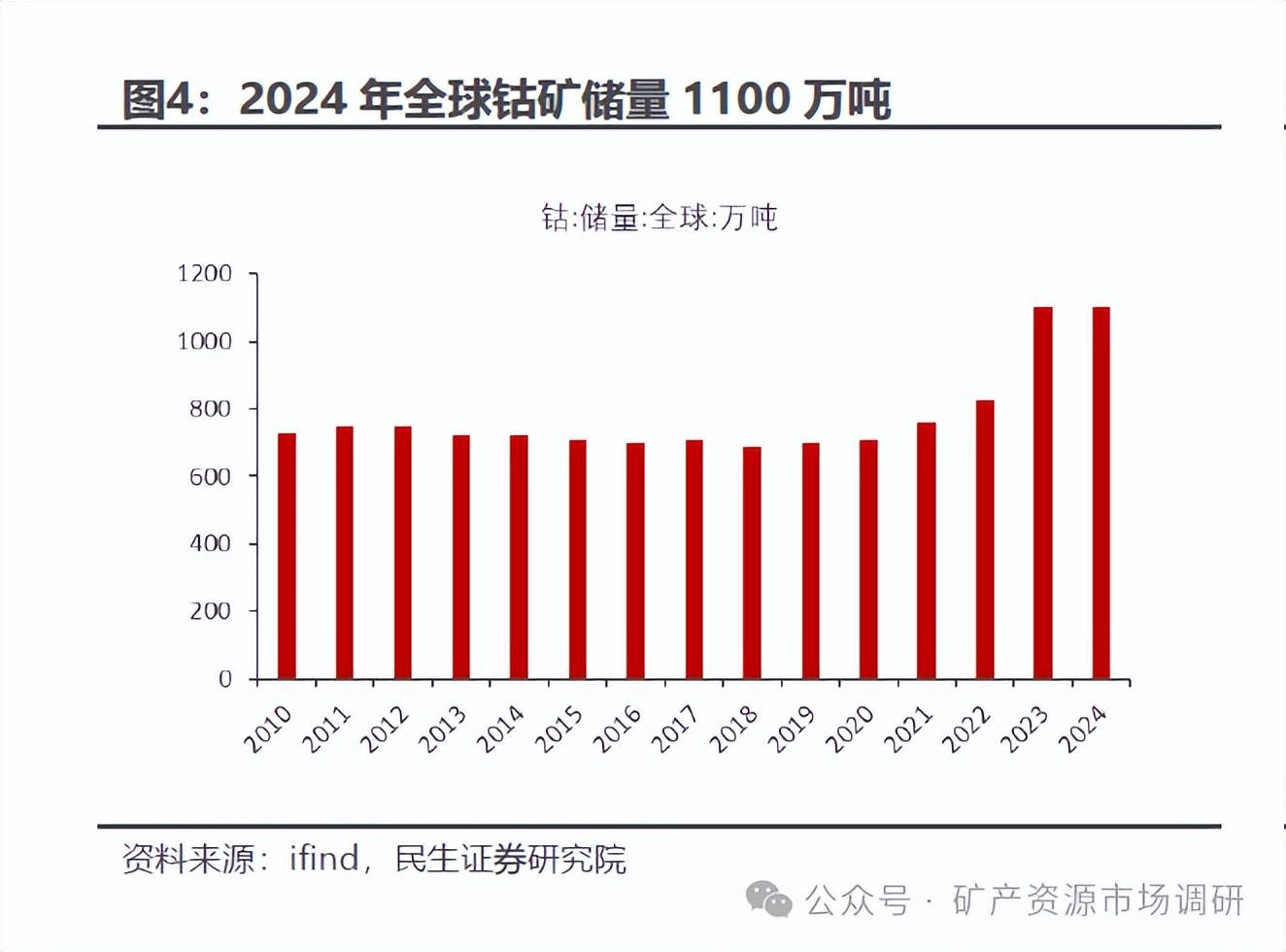 刚果金钴矿储量全球占比55%,是全球钴资源主要分布区域。钴矿一般与铜矿、镍矿伴生,因此资源集中分布在铜矿、镍矿资源较为丰富的地区。根据USGS数据,截至2024年全球钴矿储量1100万吨,从分布上看,刚果金为全球第一大钴资源大国,2024年钴矿储量600万吨,全球占比55%,澳大利亚、印尼钴资源位列全球第二、第三位,2024年全球占比分别为15%、6%。