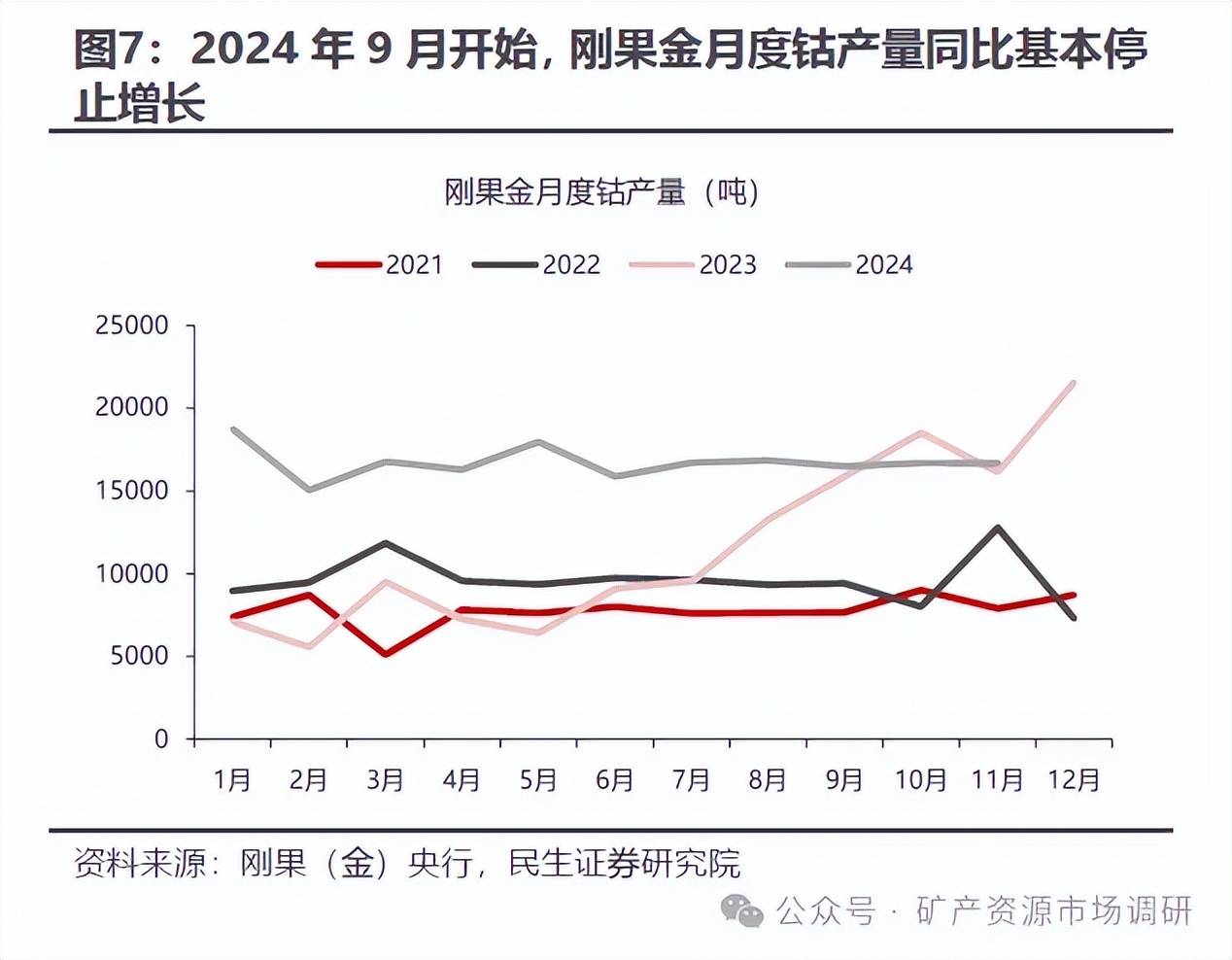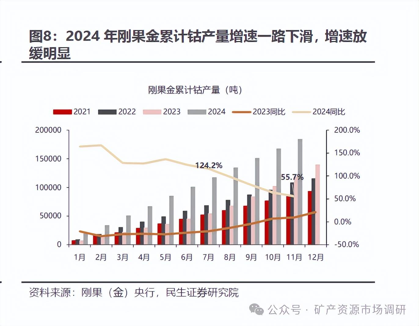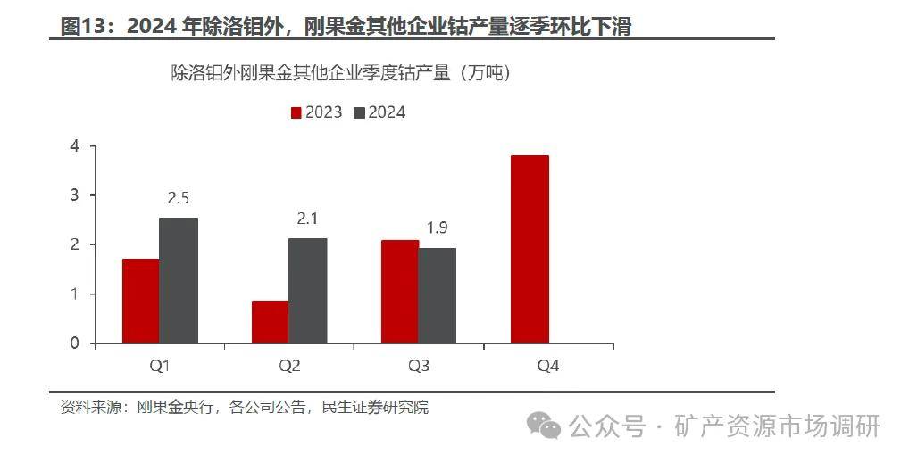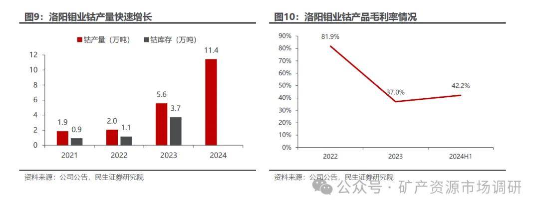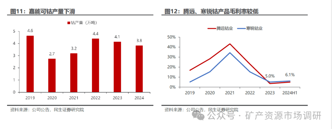 分企业看:除洛钼外,其他矿山因成本压力产量下滑。1)嘉能可产量下滑:嘉能可在刚果金拥有两大世界级铜钴矿山Mutanda 和Katanga,由于钴价持续下滑,2024 年上半年公司产量指引下调42%至3.5-4 万吨,从实际生产来看,24年钴产量3.8 万吨,同比连续两年保持下滑。3)刚果(金)其他矿山出现停产:2023-2024 年腾远、寒锐钴产品毛利率约5.5%,成本压力较大;2024 年金川国际钴产量同比下滑61.3%至855 吨,主要由于钴价持续低迷,2024 年5 月底至8 月暂停钴生产;五矿资源因钴价较低2024 年12 月对钴矿厂进行停产维护。根据我们对刚果金产量数据的跟踪,2024 年除洛钼外,其他矿企钴矿合计产量逐季环比下滑,由24Q1 的2.5 万吨减至24Q3 的1.9 万吨,24Q4 我们预计减量更明显。因此,在刚果金暂停出口政策落地前,我们认为除洛钼外,当地矿山钴生产普遍亏损,这也是刚果金政府出台限制供给政策的核心原因。