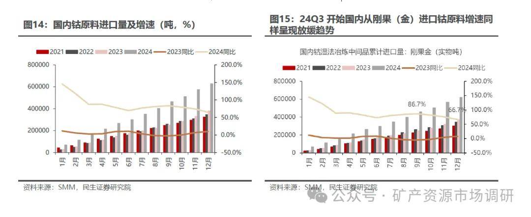 进口:24Q3 开始刚果金钴原料进口增速同样出现放缓趋势。全球钴原料消耗主要在国内,从国内进口的钴湿法冶炼中间品来看,2024 年国内钴湿法冶炼中间品累计进口62.9 万吨,同比增加64.8%,其中刚果(金)为主要进口来源国,2024年累计进口钴湿法冶炼中间品62.0 万吨,同比增加66.7%,增幅虽明显,但从月度数据看,增幅同样出现放缓趋势,2024 年前9 个月,国内从刚果金进口的钴湿法冶炼中间品累计同比增幅为86.7%,而到12 月份的全年累计增幅为66.7%。