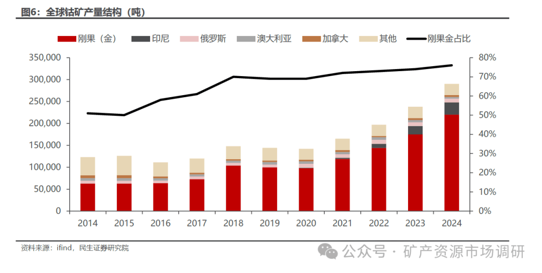 刚果(金)铜钴矿+印尼红土镍矿构成主要增量,刚果(金)钴矿产量全球占比76%左右,印尼钴矿占比约10%,刚果(金)暂停4个月钴原料出口或导致全球钴供应减量约25%。全球钴矿供应高度集中,根据USGS数据,2024年全球钴矿产量29.0万吨,同比增加21.8%,其中刚果(金)产量22.0万吨,同比增长25.7%,全球占比76%,同时印尼由于湿法镍项目逐步投产,钴原料供应快速增长,2024年产量2.8万吨,同比增加47.4%,全球占比约10%。考虑刚果(金)暂停4个月钴原料出口,或对全球钴供应造成约7.3万吨的减量影响,占全球钴供应约25%。