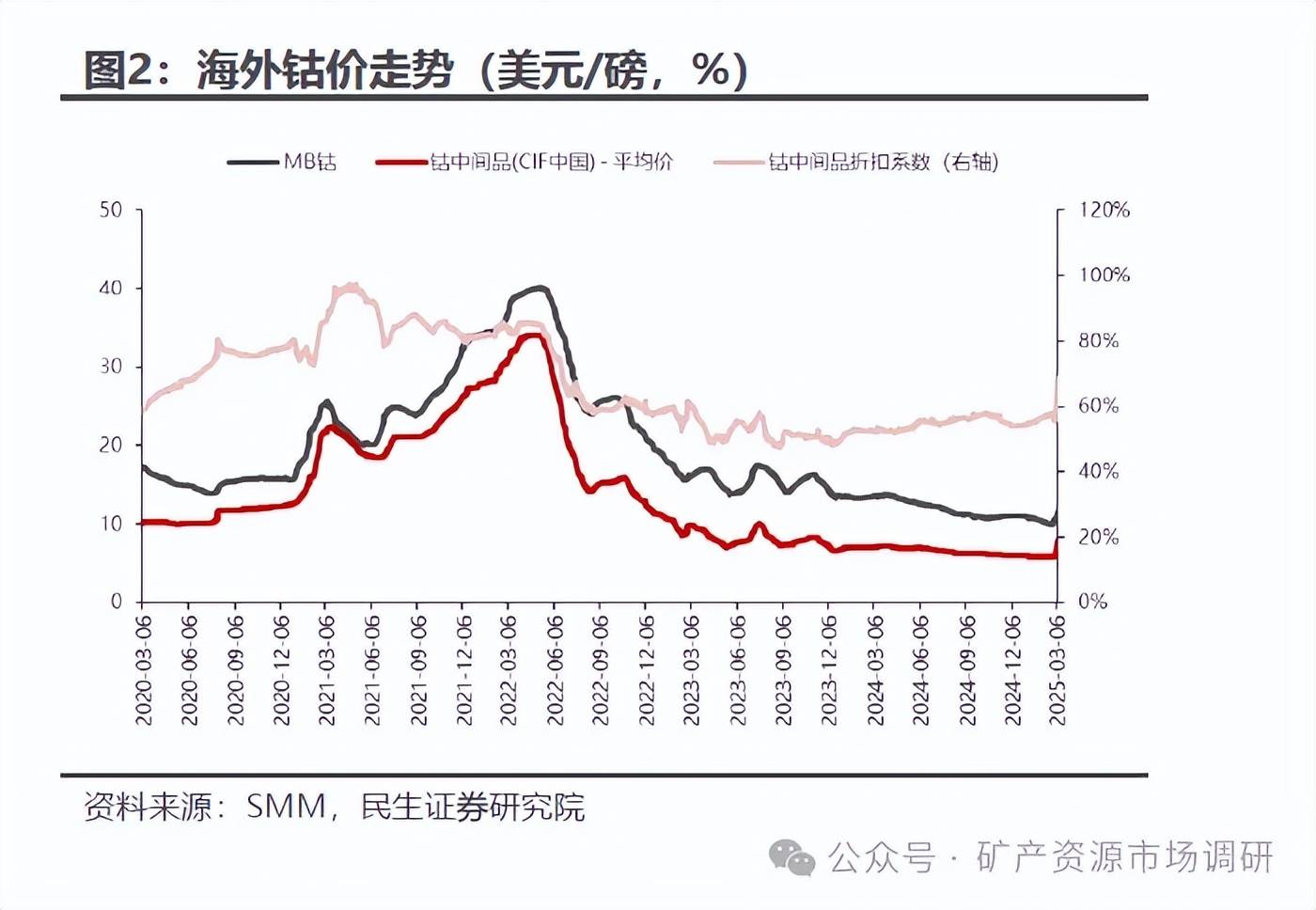 2024年钴价跌至历史最低点,从历史走势看钴价弹性较大。从钴价最近两轮周期的走势看,钴价上涨弹性较大。1)2017年6月-2018年4月:国内第一轮新能源车需求+消费电子拉动,国内电钴价格最高涨至67万元;2)2019年7月-2022年2月:国内第二轮新能源车需求刺激,国内电钴价格由22万涨至57万;3)2022年2月至今:新能源需求增速放缓,三元份额下滑,供给端新增产能释放,过剩压力下钴价持续下滑,跌至历史最低点,截至25年2月21日,MB钴价跌至9.95美元/磅,钴中间品(CIF中国)价格跌至5.57美元/磅。