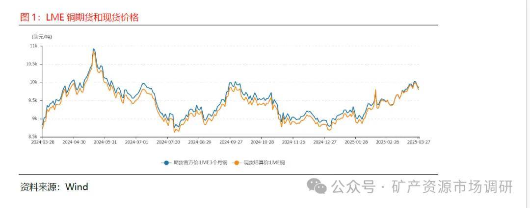美国高盛和花旗集团预测,到今年年底,美国或对铜加征25%关税,美国总统特朗普上月曾要求商务部调查进口铜情况。关税的不确定性加剧了企业对未来铜价上涨的担心,选择补库增加铜储备,短期需求增加预期将对铜价起到支撑作用。年初以来铜价大幅上涨,2025年03月27日,LME 3个月铜期货价格为9,846美元/吨,LME铜现货结算价为9,787美元/吨,期货现货价差收窄,两个市场预期较为一致。