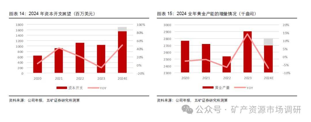 24年 展望中提升了资本开支, 产量 展望有所 下降侧面反映了奥林匹亚金锑矿的资源面临品味下行风险。 2024年预计资本支出同比 23年增长 56.3%,主要是由于矿山项目正在进行扩建,以及通货膨胀的影响加大了资本开支。公司预计 2024年全年的黄金产量将在 2700-2800千盎司之间,产量同比下降的主要原因是由于奥林匹亚达加工的矿石品位较低。