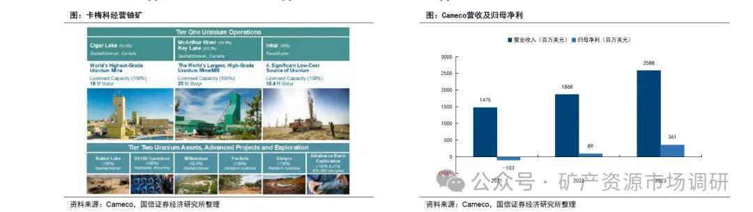 • 雪茄湖(Cigar Lake):卡梅科持股54.5%,平均U3U8品位17.03%,2023年生产15.1百万磅U3U85(折5807tU),2024年预计产18.0百万磅U3U85(折6923tU),实现满产。