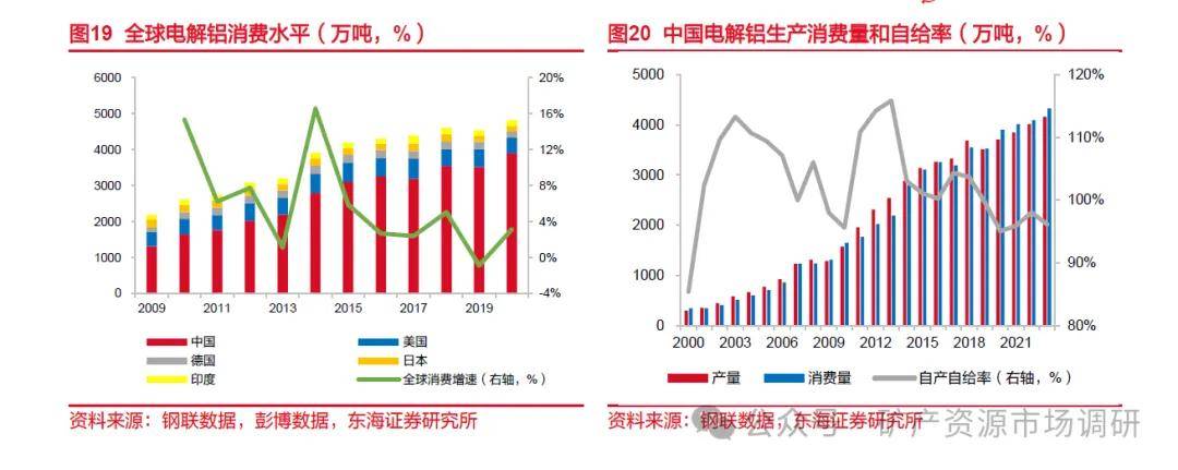 中国是全球电解铝最大消费和生产国家,至2023年底,中国电解铝年消费量约为4325.7万吨,较2022年增长5.6%,消费量迅速增长。2023年中国电解铝占全球消费比重的60%以上,较2001年增加45个百分点。中国电解铝消费增速高于全球。虽然中国电解铝消费体量巨大,但基本可以满足自产自给。2023年中国电解铝产量约为4159.4万吨,较2022年增加3.6%,2023年中国自产电解铝占电解铝消费总量的96.2%,自给程度较高。