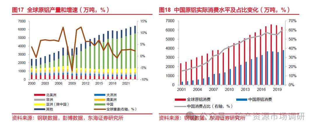 中国是全球原铝消费量最大的国家,2020年全球原铝消费量约为6347万吨,其中中国消费占比为60%,2001年以来,占比持续攀升,2016年后,占比增速明显减缓。全球原铝消费水平几乎维持稳定增长,中国原铝实际消费增速波动较大,但增速普遍高于全球变化水平。