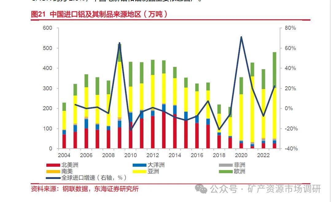 截至2023年末,中国从全球进口铝及其制品共483.71万吨,较2022年增加22%,其中51.7%来自亚洲国家和地区;36.8%铝制品来自欧洲,亚洲地区比重增加最明显。中国进口铝及其制品总量震荡增加,除2009年和2020年外,总体增幅不大,2004至2023年CAGR约为2.6%,中国电解铝和铝制品主要依靠自产。