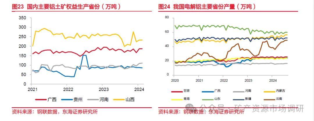 我国铝土矿生产省份地区集中,2024年8月,我国铝土矿产量最大的省份是山西省,产量为232.4万吨,我国铝土矿主要生产集中在山西、河南、贵州、广西,其余省份产量较低。除河南省外其余三省铝土矿产量均出现下滑,其中山西产量同比下降10.6%。我国电解铝产量分布较为分散,多个省份月产量超20万吨,山东、新疆、内蒙等省份月产量已超50万吨。各重点生产省份8月产量环比增幅均小于1%,产量总体变化不大。