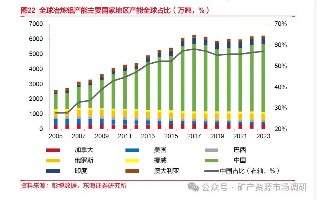 全球铝矿冶炼主要集中在头部铝矿冶炼公司。其中,我国是铝土矿、氧化铝冶炼精炼的最主要国家之一,产能占全球总冶炼总产能的一半以上。