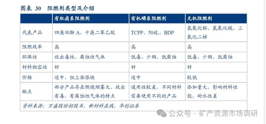卤溴系-锑系阻燃剂仍在阻燃剂市场占据重要位置。阻燃剂种类丰富,其中有机卤溴系是常用阻燃剂产品,需要与锑系阻燃剂配合使用以产生协同阻燃作用,是阻燃领域中主要的阻燃剂产品之一(2020 年占比21%)。近年来随着环保意识增强,无卤化成为阻燃领域的趋势,氢氧化铝系和有机磷系阻燃剂以其高效、低毒、少烟和低腐蚀等优点成为使用的新方向(2020 年占比52.3%)。但由于卤溴系阻燃剂所具备的高阻燃效率、长期应用稳定性以及良好的电性能等特质是无卤阻燃剂无法比拟,卤溴系-锑系阻燃剂仍然无法被其他的阻燃剂完全取代,大批环境友好的溴系阻燃剂品种,将会在今后得到快速稳定的发展,进而带动锑系阻燃剂消费量增加,预计卤溴系-锑系阻燃剂仍将是全球最主要使用的阻燃剂之一。
