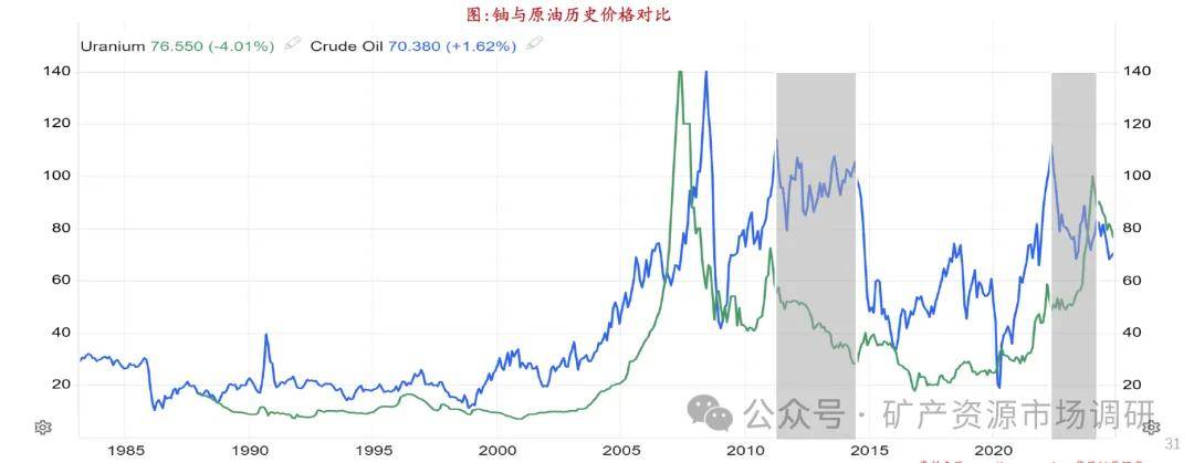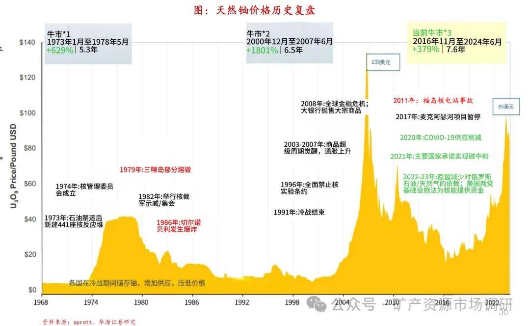 历史上经历了两轮大牛市。第一轮牛市从1973年1月到1978年5月,持续5.3年,铀价格上涨629%,起因是由于1973年的石油危机后,新建核电站441座,开始下滑则是在1979年美国三哩岛核事故之后,引发公众恐慌,以及导致核能发展的停滞。