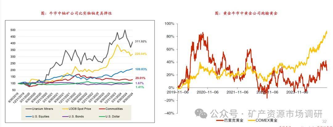 根据sprott统计,牛市中实物铀和铀矿开采商的表现明显优于其他大宗资产类别,铀矿开采商的表现更优于实物铀。过去五年(2019/9/30~2024/9/30)之间U3O8现货价格累计上涨220.04%,而大宗商品指数则上涨29.01%。同时铀矿开采商的表现不同于黄金公司在这一轮黄金牛市中跑输黄金,铀矿开采商在过去五年间累计上涨311.92%。
