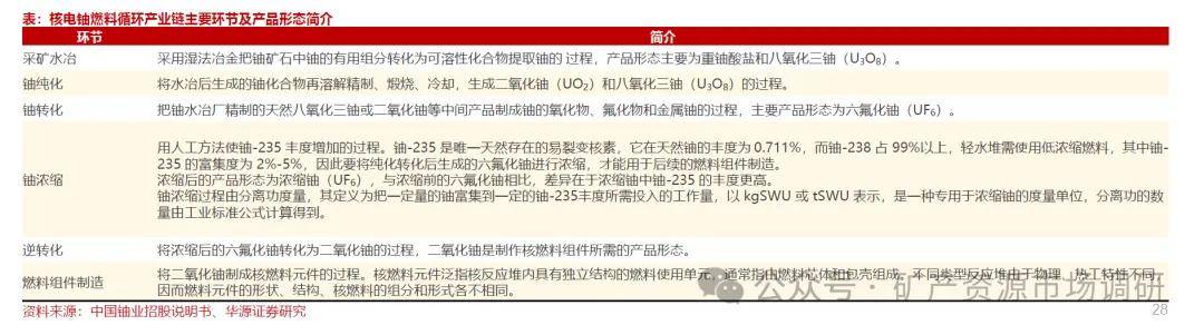 核反应堆的主要燃料为铀-235,其从开采到装入核反应堆发电之间需经过多重步骤处理,主要包括:铀采冶、转化、浓缩、燃料制造及发电,这些环节由专业化公司铀矿厂、转化厂、浓缩厂和燃料组件制造厂开展。