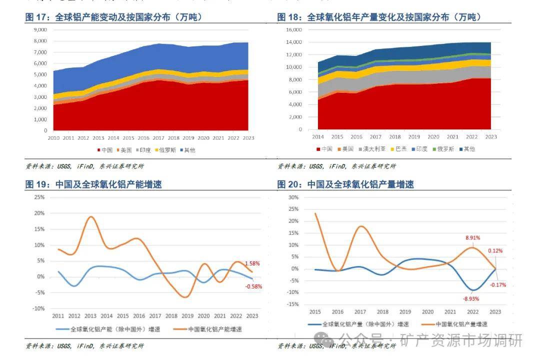 铝土矿的消费变化聚焦于全球氧化铝产业的显著扩张。全球氧化铝产能和产量在近十年内整体维持增长态势,产出增速的分化导致氧化铝产业已主要聚集于亚洲地区,其中中国氧化铝产能及产量占比已超世界一半。从数据变化情况观察,全球氧化铝总产能由2014 年至2023 年间增长87.8%至1.88 亿吨,而全球氧化铝产量同期增长29.6%至1.4 亿吨。其中中国氧化铝产能由同期3300 万吨增长212.1%至1.03 亿吨,中国地区氧化铝产量则由4780 万吨增长至8200 万吨(+58.8%),中国的氧化铝产能及产量已分别占全球54.9%及58.6%。全球及中国氧化铝行业的快速扩张有效拉动铝土矿需求总量的明显提升。从数据观察,按产能角度计算,截止2023 年全球铝土矿年消费量可增至约3.76 亿吨,中国铝土矿年消费量可增至2.06 亿吨;铝土矿需求总量十年间分别增长1.76 亿吨(+88%)及1.4 亿吨(112%)。