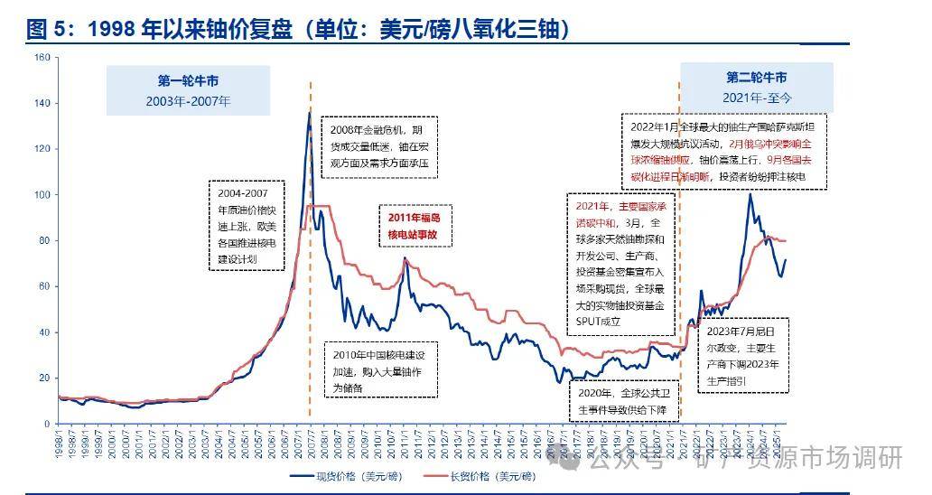 2003 年1 月-2007 年6 月:铀价从10 美元/磅,大幅上涨至130 美元/磅以上,达到历史最高位。这一阶段刺激铀价上涨的主要原因在于,一是伊拉克战争导致原油供应市场预期长期动荡,国际原油价格大幅上涨,欧美及亚洲各国为减缓对中东和俄罗斯石油依赖风险,开始推进核电建设计划;二是多国开启核电长期布局,美国推出《能源政策法案》,提出核能2020 计划。欧盟承认核电对能源供应稳定和减少碳排有战略意义,法国开始建设首座EPR 三代核电站,英国提出重启核电。中国从2005 年开始将核电发展力度从“适度发展”调整为“积极发展”,发布《中长期核电发展规划(2005–2020 年)》;三是2006 年前后加拿大卡梅科(Cameco)公司麦克阿瑟河(McArthur River)与雪茄湖(Cigar Lake)项目两大世界级矿山遭遇技术事故与洪水,造成供给预期大幅收紧,推动铀价加速上行。