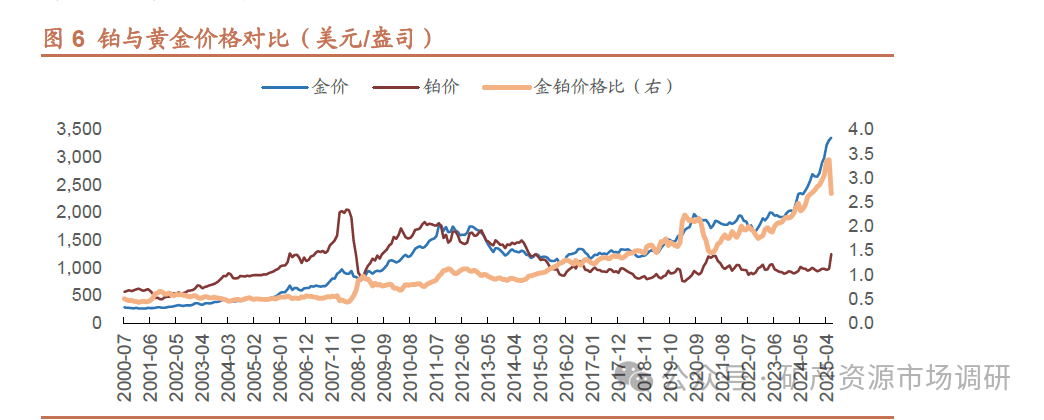2025 年,金铂价格比一度触及历史高点。2008-2015 年间,金与铂的价格比在1.0 上下,随着铂价在2011-2018 年间持续下行,金铂价格比明显抬升,2018年之后铂价底部震荡而金价中枢再度提升,2023 年以来金价更是一路走高,使得金铂价格比在2025 年5 月一度达到3.38 的高位,6 月之后金价震荡调整,铂价补涨,价格比回落至2.68。