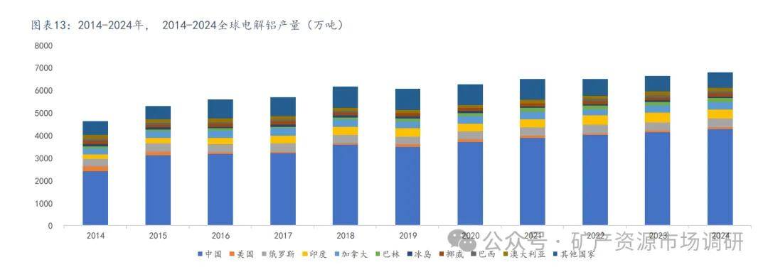 据USGS数据,2024年全球电解铝产量为7200万吨。其中我国年产量为4300万吨,我国电解铝产量依旧是占据全球第一的位置,占全球产量高达60%;其次则是印度,年产量为420万吨,占全球产量的6%;俄罗斯和加拿大年产量分别为380和330万吨,皆占全球产量的5%。