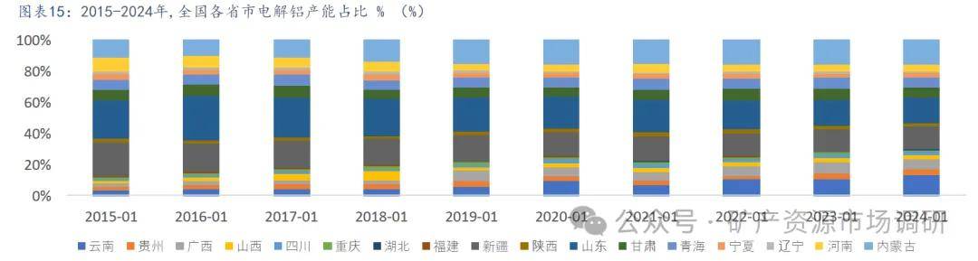 过去十年,中国电解铝行业完成了“东铝西进,北铝南移”的产业化进程。2017年4月,国家发改委等四部委联合发布《清理整顿电解铝行业违法违规项目专项行动工作方案的通知》,由此拉开了国内电解铝行业深化供给侧结构性改革的大 。2018年1月工信部发布《工业和信息化部关于电解铝企业通过兼并重组等方式实施产能置换有关事项的通知》,加速电解铝产能向西南转移,当年中铝120万吨产能转移到云南。2019年,全国电解铝产能跨省置换300多万吨,其中246万吨置换至云南。截止2024年底,全国电解铝产能4500万吨,云南省电解铝产能达到585万吨,是2015年118.6万吨的5倍,全国占比从2015年不到4%,至今占比13.77%。同时,也完善了铝产业链的布局,铝一体化、 素制品等。